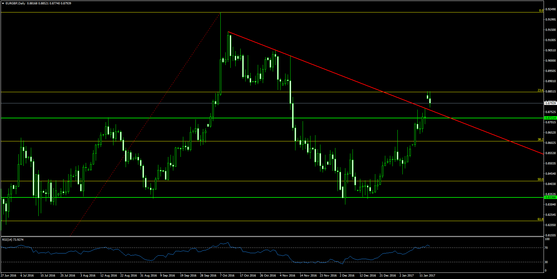 Il lungo percorso di ribasso che ha preso il via da lì in poi si è ormai del tutto invertito ed EUR/GBP segue un trend rialzista che prosegue imperterrito da circa 1 mese.