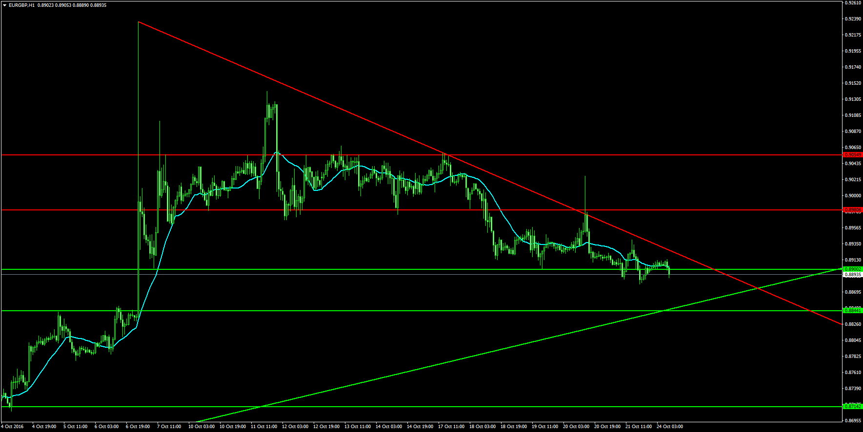 Come osservabile dalla trendline in rosso nel seguente grafico H1, euro-sterlina è sceso dai massimi a 0,92 fino all’attuale 0,889 rispettando un trend ribassista che la scorsa settimana ha rivelato la propria natura: