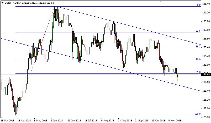 Il rimbalzo avvenuto a colmare il gap d’apertura potrebbe essere solo una correzione momentanea e la prospettiva ribassista potrebbe essere presto riconfermata. Saranno decisivi però i dati macroeconomici e i seguenti commenti di Mario Draghi per scatenare la volatilità: nel caso in cui i dati deludessero le aspettative e il presidente della BCE si esprimesse in maniera decisiva sul Quantitative Easing 2, potremmo allora assistere nell’arco della mattinata ad una vera e propria caduta fino ai supporti di 131.06, 130.20 e 129.60. Viceversa, una ripresa degli acquisti riporterebbe il cambio EUR/JPY verso il polo d’attrazione costituito dal livello del 50% di Fibonacci a quota 133.54.