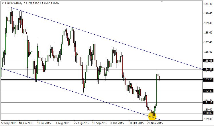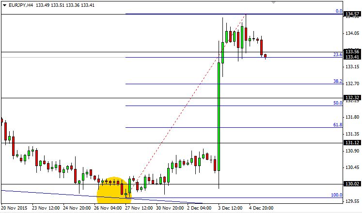 Dopo le decisioni della BCE e di Mario Draghi, il cambio EUR/JPY ha raggiunto il target che avevamo individuato a quota 133.56 ed è arrivato fino alla successiva resistenza di 134.57. Al momento la quotazione è alle prese con il supporto del 23,6% del ritracciamento di Fibonacci a 133.41 e nel caso di una rottura ribassista potrebbe tornare fino a 132.69 e 132.32. Nel caso in cui i supporti di Fibonacci riuscissero invece a frenare la discesa del cross euro-yen, la quotazione potrebbe allora risalire verso 134.57 e 135.48, fino ad andare a testare il canale di trend che guida il cambio EUR/JPY dallo scorso giugno.
