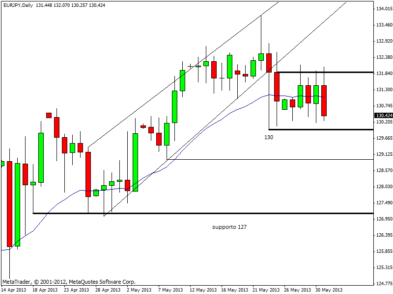 Molto debole è anche il cross euro/yen, che resta inserito all’interno di una fase di congestione ma che potrebbe andare ad effettuare il breakout ribassista del supporto di 130 in caso di peggioramento del sentiment degli investitori. Se i prezzi dovessero scendere con decisione sotto 130, il cambio sarebbe proiettato subito a 129 e nei giorni successivi fino alla major support area di 127.