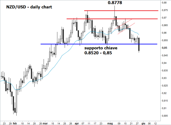Sta soffrendo molto il dollaro neozelandese, sul quale ha pesato anche la deludente lettura dell’indice di fiducia delle imprese, elaborata da ANZ Bank, che a maggio è sceso a 53,5 punti dai 64,8 punti del mese precedente. Rispetto al picco di febbraio scorso è avvenuta una flessione di ben 17 punti. La debolezza del Kiwi è da ricondurre anche a motivazioni prettamente di carattere tecnico, come il raggiungimento di resistenze di lungo periodo molto significative, che hanno innescato forti vendite sui mercati valutari.