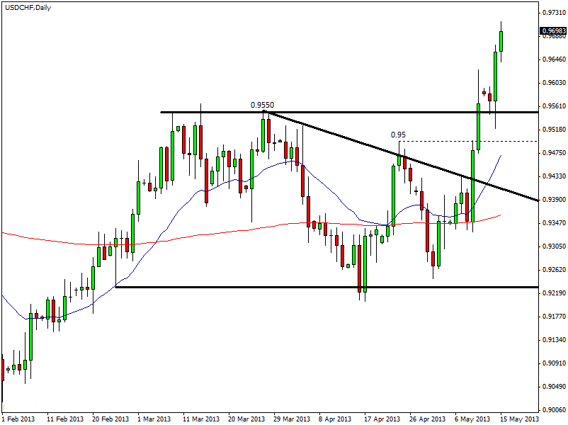 Il clima di appetito per il rischio e la riduzione delle riserve valutarie della Swiss National Bank (SNB) stanno creando i presupposti per un’accelerazione ribassista del franco svizzero, che questa mattina è sceso sui livelli più bassi da agosto 2012 sul dollaro americano. Il tasso di cambio Usd/Chf è salito fino a 0,9715, registrando così una performance del 3,9% nel giro di una settimana passando da 0,9350 a oltre 0,97.