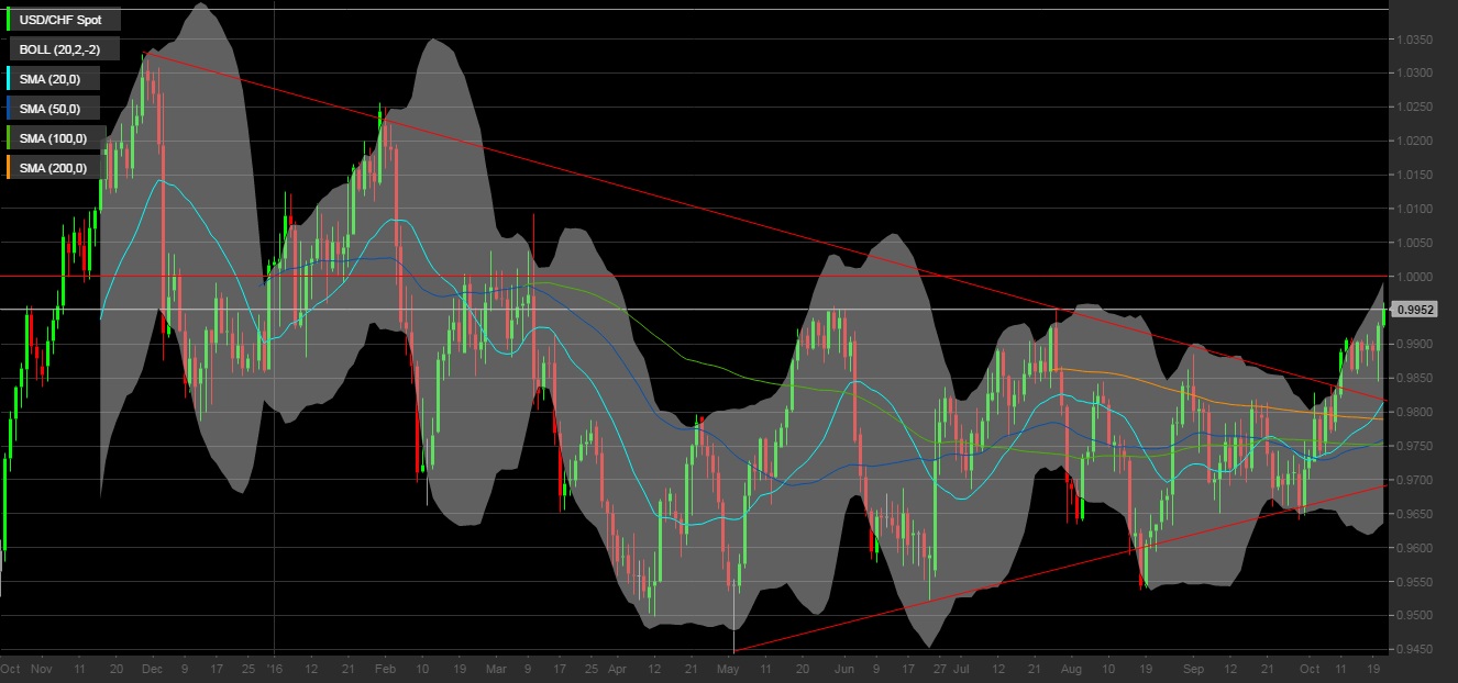 Oltre a puntare alla parità nei confronti dell’euro, il dollaro si sta avvicinando con grande dimostrazione di forza anche alla parità nei confronti della valuta rifugio per eccellenza, il franco svizzero.