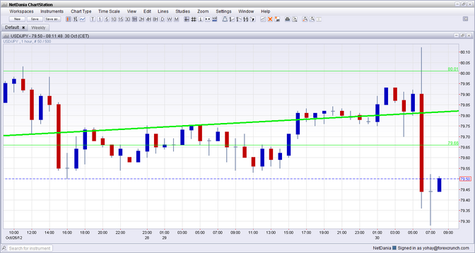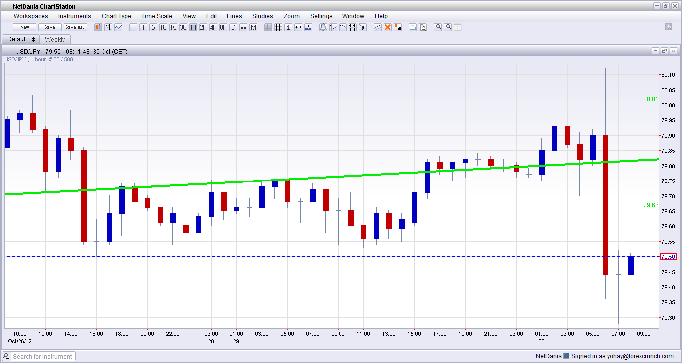 Il cambio Dollaro/Yen (USD/JPY), dopo le dichiarazioni da parte della Bank of Japan è sceso di 50 pips, da 80 al di sotto del 79.5. La Bank of Japan ha esteso il programma di quantitative easing per un totale di 11 mila miliardi di Yen (la scorsa implementazione era stata di 10 mila miliardi) che corrispondono a 138 miliardi di dollari, portando così il programma ad un totale di 91 mila miliardi di yen.