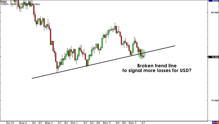 | La rottura della trend line indica possibilità ribassiste per il Dollaro? (Babypips) |