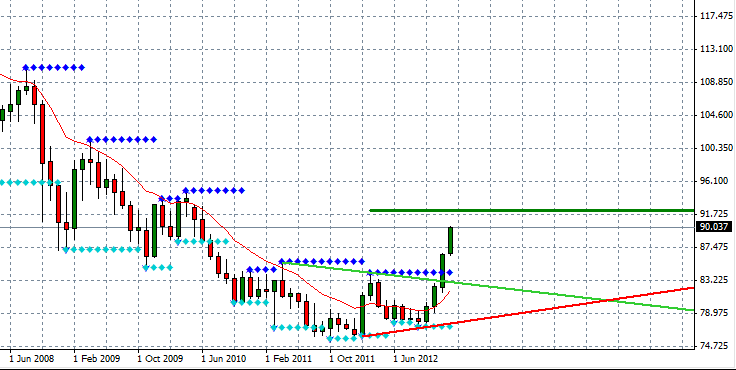 Dal grafico mensile, risulta che il target del trend rialzista sul cross non sia ancora stato raggiunto: le ultime nove sedute di Gennaio potrebbero, a mio parere, spingere il cross a raggiungere il target posto in area 92.00.