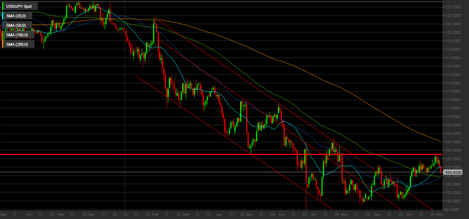 Sembra pesare molto sui prezzi la resistenza in area 105, preciso il rimbalzo al ribasso del cross USD/JPY avvenuto dopo aver testato tale livello. A fungere da supporto ora sono le medie a 50 e 100 periodi in area 103, livello al quale si trovano ora i prezzi. Il trend ribassista di fondo sembrava voler provare l’inversione, ma purtroppo lo scenario macro non ha dato la giusta forza ai prezzi.