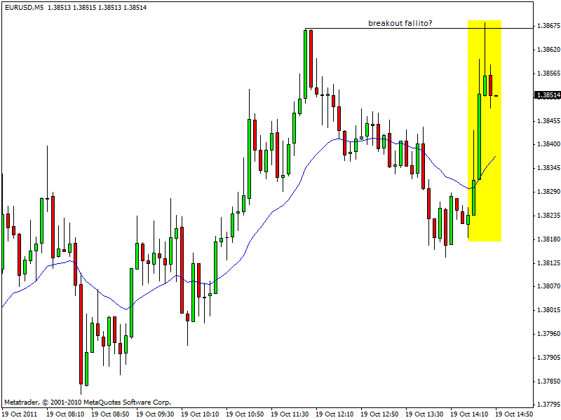 Il dato sull’inflazione negli Stati Uniti nel mese di settembre ha mostrato un +0,3%, cioè in linea con le attese degli analisti e inferiore al dato precedente che era fermo allo 0,4%. Il Dipartimento del Lavoro USA ha comunicato anche l’altro fondamentale dato sull’inflazione, cioè il CPI “core”. L’indice dei prezzi al consumo, esclusi il settore energetico ed alimentare, ha mostrato una crescita dello 0,1%, cioè più bassa delle stime di consensus (+0,2%) e del dato precedente (+0,2%). Il risultato “core” annualizzato evidenzia una crescita del 2%, mentre quello complessivo del 3,9%. Dopo la comunicazione del dato i futures americani hanno iniziato una veloce salita, spingendo ulteriormente al rialzo anche l’azionario europeo che era già positivo da questa mattina. Sul Forex il dollaro americano ha perso velocemente terreno, ma più in generale gli acquisti si sono concentrati su euro e sterlina. Il cross euro/dollaro è salito con forza da area 1.3820 a 1.3870 circa, dove però è stato respinto con decisione dai venditori proprio sui massimi di giornata (vedi grafico in basso, ellipse gialla). Se Wall Street proseguirà al rialzo, in attesa del Beige Book della Federal Reserve, il cambio euro/dollaro potrebbe continuare la sua ascesa anche fino a 1.39. Bene anche euro/yen che però è stato respinto a contatto con la resistenza di 106.50, cioè il target rialzista di brevissimo periodo ipotizzato nel report di questa mattina. Sul Forex è molto tonica la sterlina con il cable salito fin sopra 1.5830 e attualmente sui top intraday: il cambio è decisamente proiettato verso l’area di resistenza di 1.5850. Tra le commodity continua il movimento lateral-ribassista dell’oro, attualmente in area 1650$ l’oncia, mentre sembra molto più tonico il petrolio Wti che è proiettato verso 89$ al barile.
