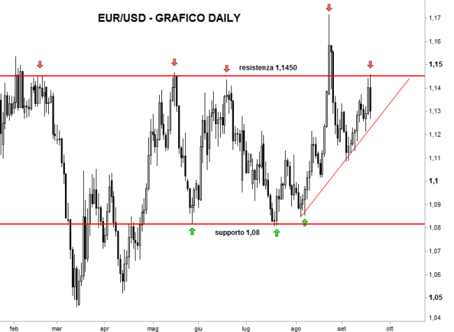 Il tasso di cambio Euro/Dollaro non è riuscito a superare l’area di resistenza chiave di 1,1450, anzi ha sperimentato un brusco dietrofront che ha portato subito i prezzi sotto 1,13. Secondo uno studio di Bloomberg, entro dodici mesi il cambio EUR/USD potrebbe approdare sula parità. Al momento la proiezione appare troppo ottimistica, ma di certo non può essere escluso un significativo deprezzamento almeno fino a 1,08. Entro fine anno il cambio dovrebbe quotare tra 1,08 e 1,05, avvicinandosi così ai bottom di marzo scorso di area 1,1460. Il greenback dovrebbe salire molto anche nei confronti di sterlina e yen, ma soprattutto contro le valute oceaniche e ancora una volta nel confronto con le monete emergenti (real brasiliano, rublo russo e lira turca in primis).