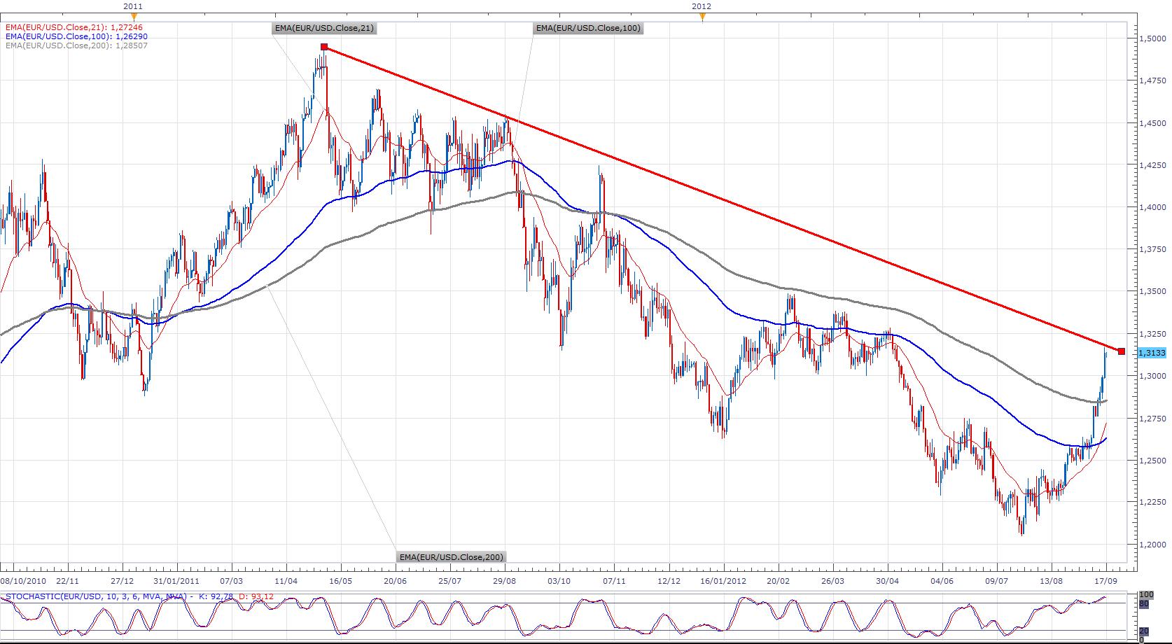 Davvero senza freni la moneta unica, riesce a compiere un passo di più in direzione del massimo di riferimento più interessante che abbiamo visto ad inizio maggio, 1.3270. Un grafico giornaliero chiarisce il prossimo livello da superare per giungere sui massimi di maggio e oltre: la trendline negativa che insiste sul cambio da un anno e quattro mesi indica proprio nel massimo raggiunto venerdì, 1.3170, il livello dinamico da oltrepassare. Nelle ultime ore abbiamo notato una buona tenuta del livello di supporto di 1.31 che può essere utilizzato come livello di breve.