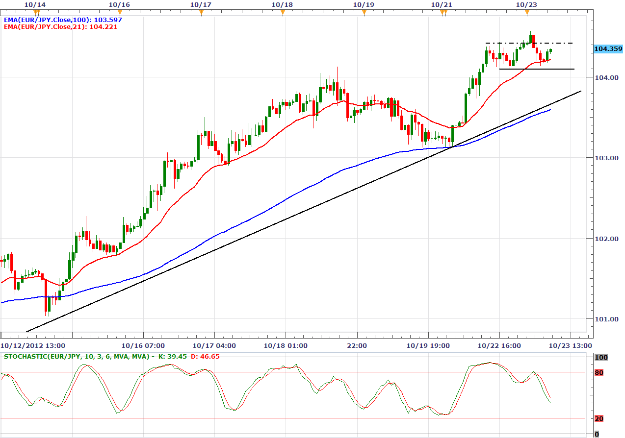 La media mobile a 100 periodi oraria che ha tenuto molto bene su un grafico orario e che ci ha suggerito potenziali tentativi di rotture rialziste ha alla fine portato al raggiungimento dell’area di target, pur non avendo quotato esattamente 104.60. Ci troviamo ora in presenza di un trend rialzista consolidato, che vede l’area sopra 103.60 come forte supporto (media a 100 e trendline) e che potrebbe essere invertito dalla formazione di un testa e spalle ribassista. Condizione necessaria per la sua formazione definitiva è il fatto che i prezzi non tornino sopra i massimi della prima spalla, cosa che se dovesse accadere (tra l’altro significherebbe che la media a 21 ha tenuto definitivamente sul tentativo di correzione della notte, e come sappiamo è tutt’altro che improbabile dopo forti aumenti di volatilità) potrebbe portare a nuovi massimi in area 105.00. Una discesa sotto 104.00 farebbe aumentare le pressioni ribassiste che, come detto, non diverrebbero definitive se non al superamento dei supporti più importanti.