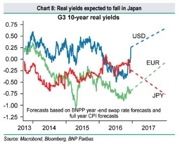 Secondo la banca, lo yen (JPY) sarà probabilmente la valuta più debole tra le monete del gruppo G10 nel 2017, e il cambio dollaro-yen salirà fino a raggiungere quota 128. Inoltre, in contrasto con le previsioni sulle altre valute principali, BNPP non si aspetta che lo yen recuperi contro il dollaro nel 2018; invece, il deprezzamento della valuta giapponese è destinato a continuare.