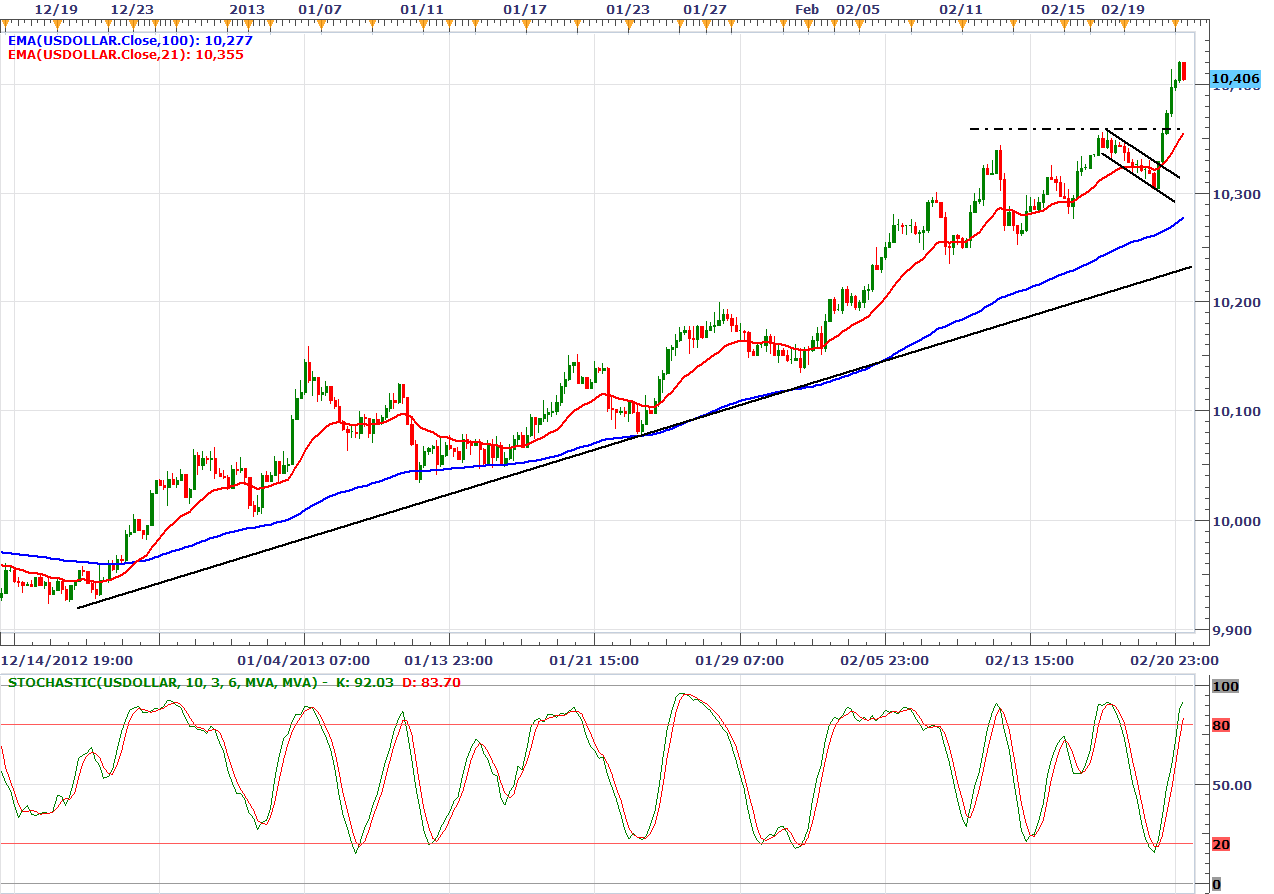 Il risultato di tutti questi movimenti interconnessi ha portato il DJ FXCM Dollar Index (che a differenza del dollar index classico contempla al suo interno, con un peso iniziale paritetico del 25%, lo yen, la sterlina, l’euro ed il dollaro australiano, approfondimento) a compiere i massimi assoluti da due anni a questa parte e se osserviamo un grafico a 4 ore risulta chiaro come la rottura a rialzo della bandiera rialzista individuata nei giorni scorsi abbia portato a buone opportunità operative, che sono migliorate ulteriormente dopo la rottura dei massimi assoluti.