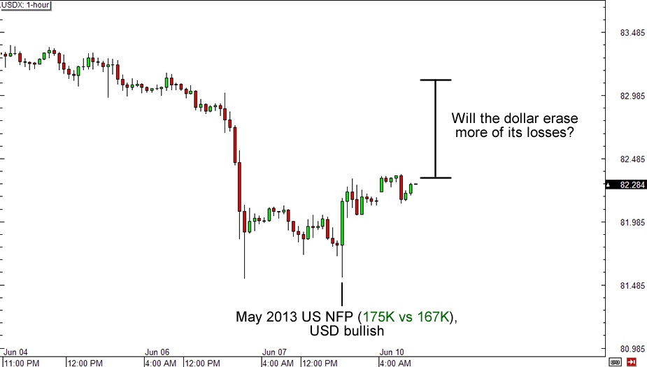 Come si può vedere, il report sul lavoro ha suscitato molto scalpore nei mercati e ha spinto il dollaro in alto. Tuttavia, ciò non è stato sufficiente per annullare completamente le perdite del dollaro dei giorni precedenti al rilascio dei dati, il che suggerisce che il dollaro non si è completamente scrollato di dosso le preoccupazioni dei mercati sul QE.