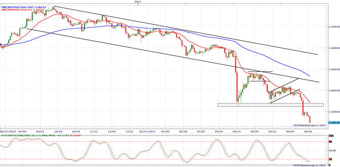 Questa mattina non cominciamo da Draghi e dal suo discorso ieri a Berlino, ma poniamo l’accento subito sui prezzi, con l’oro in pole position. Durante la notte abbiamo infatti rotto i supporti sia di breve che di lungo periodo, raggiungendo quel livello di 1,250.00 che si attendeva da un po’ di tempo e aprendo le strade per ulteriori svalutazioni del metallo giallo che vedono ora in 1,225.00 dei possibili punti di arrivo.