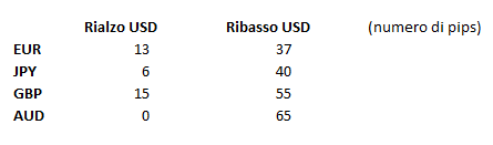 Se guardiamo questa semplice tabella ci accorgiamo di come, in base alla liquidità presente su ogni cambio, i movimenti siano stati più o meno profondi (cambi più liquidi tendono a muoversi di meno, soprattutto in condizioni di concomitanza di decisioni nel vendere il dollaro americano, non importa contro quale valuta). A parte il rialzo del dollaro pre dato abbastanza confuso, se ci concentriamo sulla vendita vediamo come a partire dal cambio più liquido preso in esame (EurUsd) fino ad arrivare al meno liquido (AudUsd) i movimenti cominciano ad avere senso e questo ci è utile, se ripetuto nel tempo, a livello operativo per cogliere ritardi di movimento su alcuni di questi cambi. I fattori negativi risultano invece dalle borse che non hanno reagito nella maniera in cui ci si poteva aspettare, ma ieri abbiamo sottolineato in maniera molto forte, se vi ricordate, proprio il fatto di porre attenzione soltanto ai potenziali aumenti di volatilità derivanti dal versante macro e di lavorare in base ai livelli tecnici in quanto le pubblicazioni macroeconomiche avrebbero potuto portare effetti direzionali “logici” soltanto sul fronte valutario.