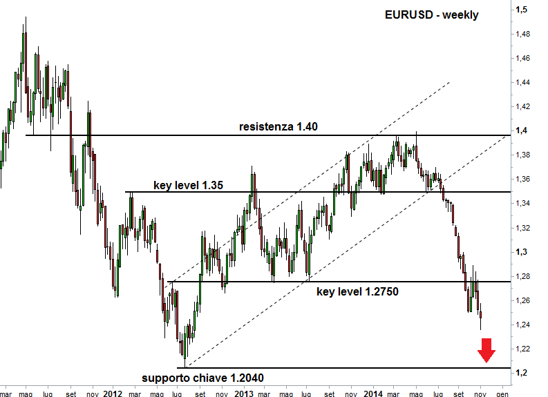 Ad ogni modo lo specialista del mercato valutario di Amundi, intervistato da Plus24 de Il Sole-24 Ore, ritiene che ha senso pensare che il cambio euro-dollaro possa spingersi fino in area 1,20, anche se bisognerà capire quali saranno le prossime mosse della BCE. Facchinato aggiunge che “l’area tra 1,20 e 1,25 rappresenta in questo momento un probabile range di equilibrio”. Venerdì il cambio ha toccato ha toccato il minimo più basso da fine agosto 2012 a 1,2358, per poi risalire la china fino a 1,2470 dopo la pubblicazione dei dati sul mercato del lavoro negli Stati Uniti per il mese di ottobre.