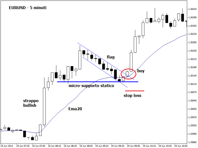 Il grafico in alto si riferisce al tasso di cambio euro/dollaro, time frame a 5 minuti, interessato da un improvviso strappo rialzista dei prezzi con l’apertura dei futures europei. Dopo una forte ascesa delle quotazioni avviene un pullback, che si protrae fino a un micro-supporto statico che coincide anche con il supporto dinamico della Ema20. Il ritracciamento avviene con bassa volatilità e all’interno di una flag. Non appena i prezzi tornano a salire, si può intervenire long con stop loss di pochi pip e rendimento atteso pari ad almeno due volte il rischio iniziale.