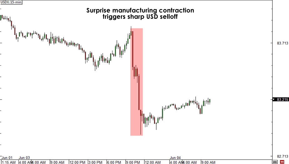 Tra le previsioni che si aspettavano una lettura di 50,6, l’ISM PMI manifatturiero è sceso a 49,0 dal 50,7 di maggio. Ricordate, 50 è la linea di demarcazione tra crescita e contrazione. Una lettura superiore a 50 significa che il settore è in espansione, mentre una lettura al di sotto di questa cifra significa che si sta restringendo. Questo ha perciò segnato la prima contrazione del settore in sei mesi e la più ripida discesa in quattro anni.