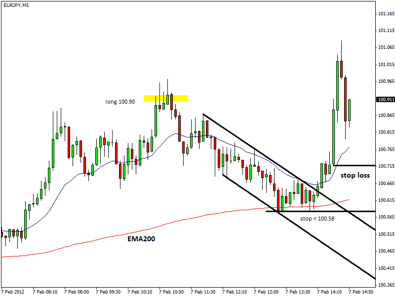 Come è possibile notare dai frequenti aggiornamenti odierni, l’incremento della volatilità richiede molta più attenzione in quanto sarebbe davvero un peccato farsi travolgere da improvvisi e bruschi cambiamenti del trend considerando l’incertezza dovuta alla crisi greca. Il cambio euro/yen, sul quale siamo long da 100.90, è rimbalzato sopra la EMA200 a 5 minuti con grande forza. I prezzi sono saliti fino a 101.08. A questo punto mi sembra doveroso aggiornare lo stop loss ancora più in alto sotto 100.72 (da 100.56), cioè il minimo della long candle a 5 minuti delle ore 14.30. Da segnalare che euro/franco svizzero ha toccato un nuovo massimo intraday a 1.2096.