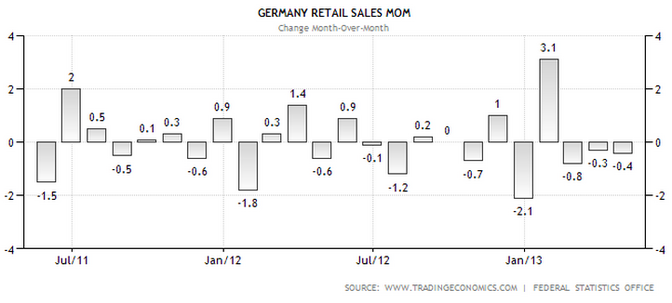 Su base mensile, le vendite al dettaglio in Germania sono scese dello 0.4% nel mese di aprile, a seguito del calo dello 0.5% nel mese precedente e scendendo oltre le aspettative degli analisti che avevano previsto un calo dello 0.3%.