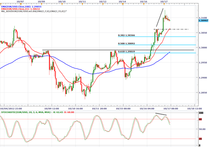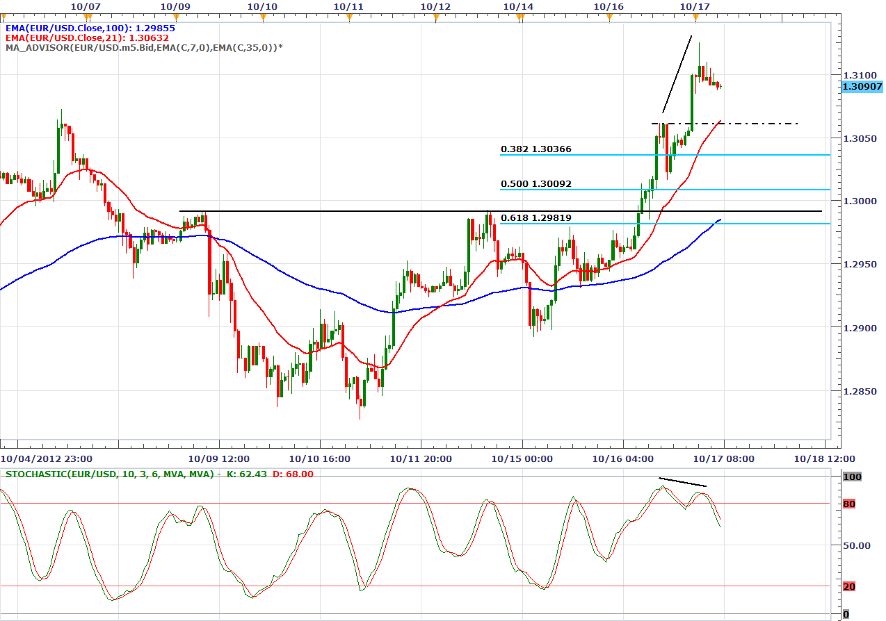 Le commodity currencies, in questo scenario, non hanno reagito in maniera direttamente correlata con il rischio e hanno visto partire movimenti di rottura di breve periodo soltanto sull’australiano, seguito dal neozelandese che comunque si mantiene sotto le resistenze, movimenti che non hanno prodotto nessun effetto sul dollaro canadese che è andato addirittura a muoversi in senso opposto, perdendo quasi una figura nei confronti del greenback. Le materie prime hanno seguito il movimento di rialzo generalizzato avvenuto sulle borse, ma il petrolio non è per ora stato in grado di superare le resistenze (a proposito, ricordo a tutti i trader sul petrolio che domani, 18 ottobre 2012, scadranno i CFD sul WTI – contratti di novembre) e che oggi è prevista la comunicazione delle scorte per la settimana negli USA, dato che ultimamente ha portato molta volatilità sul mercato).