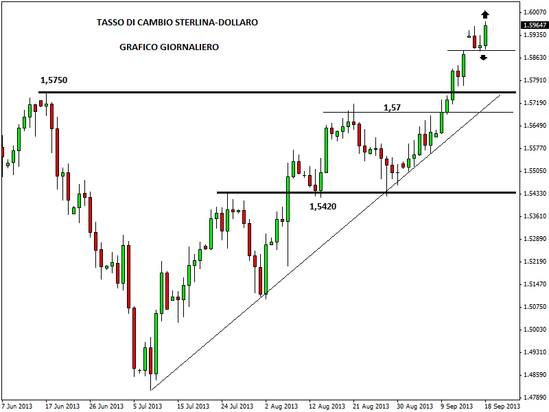 Sul forex il tasso di cambio sterlina-dollaro ha aggiornato i massimi degli ultimi 8 mesi, toccando quota 1,5979. Il cable è ormai proiettato verso quota 1,60 e sta affrontando importanti resistenze di medio periodo. Tuttavia, il futuro del cambio dovrebbe essere notevolmente influenzato dalle decisioni di stasera della FED, che sembrerebbe pronta ad annunciare l’avvio del tapering per un importo compreso tra i 10 e i 15 miliardi di dollari. Il segnale di inversione di breve periodo si avrebbe solo in caso di perdita decisa di 1,5880 e in questo caso si potrebbe assistere a una discesa fino a 1,5750 prima e 1,57 poi.