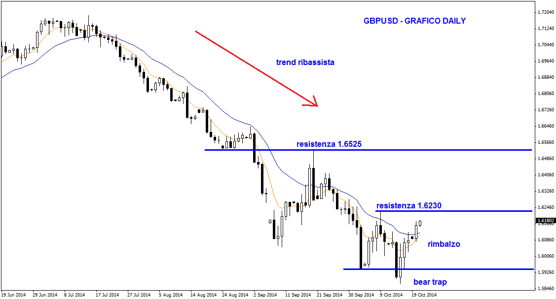 Meno di una settimana fa il cross EURGBP era salito nuovamente in area 0,8050, prima di sperimentare una forte correzione in area 0,79. Sul finire di settembre questo tasso di cambio era sceso fin sotto 0,7770, toccando il minimo più basso da oltre due anni. La sterlina non se la passa molto bene nei confronti del dollaro americano, tanto che il cambio GBPUSD è passato dagli 1,7190 di metà luglio scorso a un valore di 1,5874 appena sei giorni fa. Il Cable è scivolato sui minimi da novembre 2013, ma ieri si è riportato in area 1,6180.