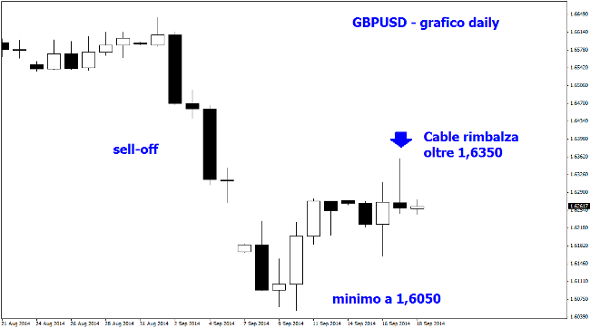 Sul forex la sterlina prosegue la fase di recupero dai bottom di periodo di area 1,6050, in un clima di elevata volatilità proprio per l’incertezza sul referendum dell’indipendenza della Scozia. Se dovesse prevalere il fronte del “no”, il pound sarebbe destinato a rimbalzare ancora con forza, mentre l’eventuale storica vittoria dei nazionalisti potrebbe creare i presupposti per un vero e proprio tracollo della sterlina fino a 1,55 sul dollaro americano secondo gli esperti di Scotiabank.