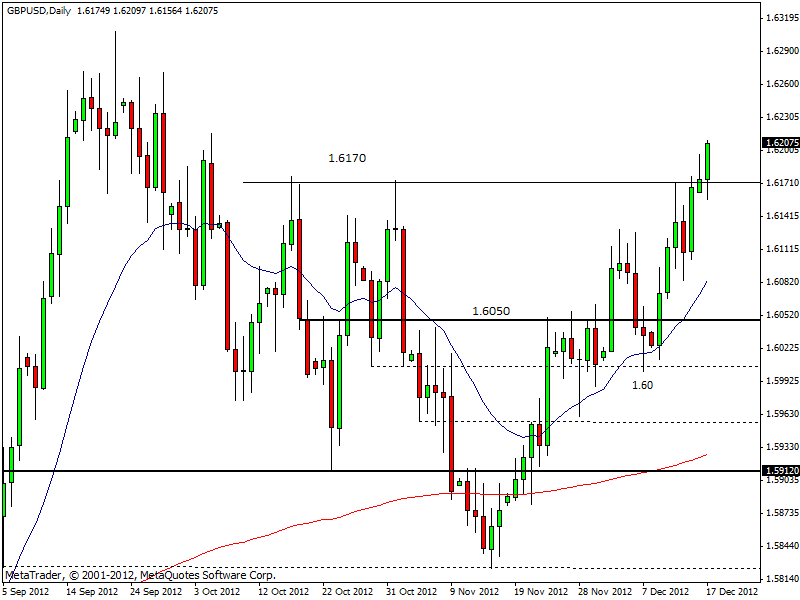 Continua l’ottimo momento della sterlina, che sul forex ha toccato il massimo più alto da oltre due mesi contro il dollaro americano. Il tasso di cambio sterlina/dollaro è salito fino a 1,6213, superando così definitivamente l’ampia resistenza giornaliera posta tra 1,6170 e 1,62.