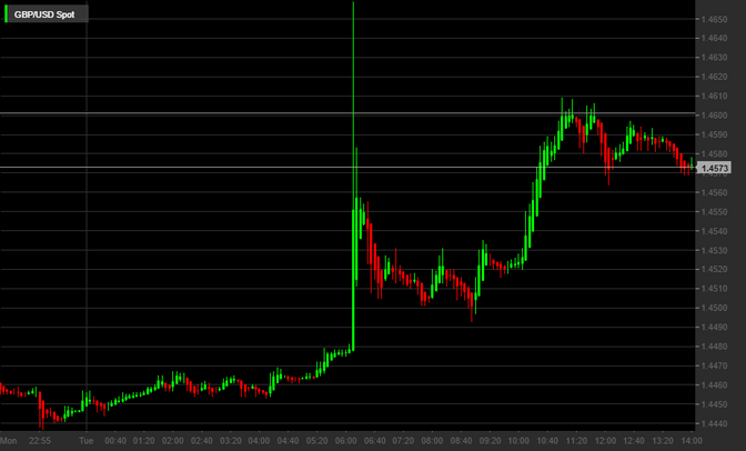 Durante la sessione asiatica di oggi, alle 06:05 di mattina (ora italiana) la sterlina è schizzata al rialzo nell’arco di pochissimi secondi contro il dollaro USA da $1.4480 a $1.4583, creando una lunga candela rialzista, prima di tornare a scendere altrettanto velocemente.