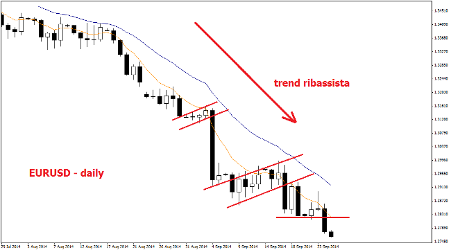 Il tasso di cambio EURUSD ha aggiornato i minimi degli ultimi 16 mesi, scendendo sotto la soglia psicologica di 1,28. I prezzi si stanno dirigendo verso il maxi-supporto settimanale posto in area 1,2750. Nel corso della sessione asiatica è avvenuto un calo fino a 1,2762. In caso di breakout ribassista esplosivo di questa zona di supporto di medio-lungo periodo, il cambio euro/dollaro potrebbe addirittura approfondire ulteriormente il trend discendente iniziato lo scorso maggio da area 1,40. I prezzi dovrebbero approdare senza grossi problemi in area 1,2660 e magari poi a 1,25.