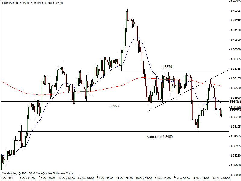 Sul Forex l’euro è sotto il tiro delle vendite, anche se da una mezz’ora circa sta reagendo molto bene. Il cross EUR/USD è sceso a 1.3575 mentre ora quota in area 1.3615. Se il rimbalzo dovesse proseguire, il prossimo target sarà senza dubbio 1.3650 e forse anche 1.3680. Tuttavia, in caso di peggioramento del sentiment e accelerazione al ribasso dei listini europei, il cambio potrebbe perdere nuovamente quota e andare a testare i supporti di area 1.3580-70.