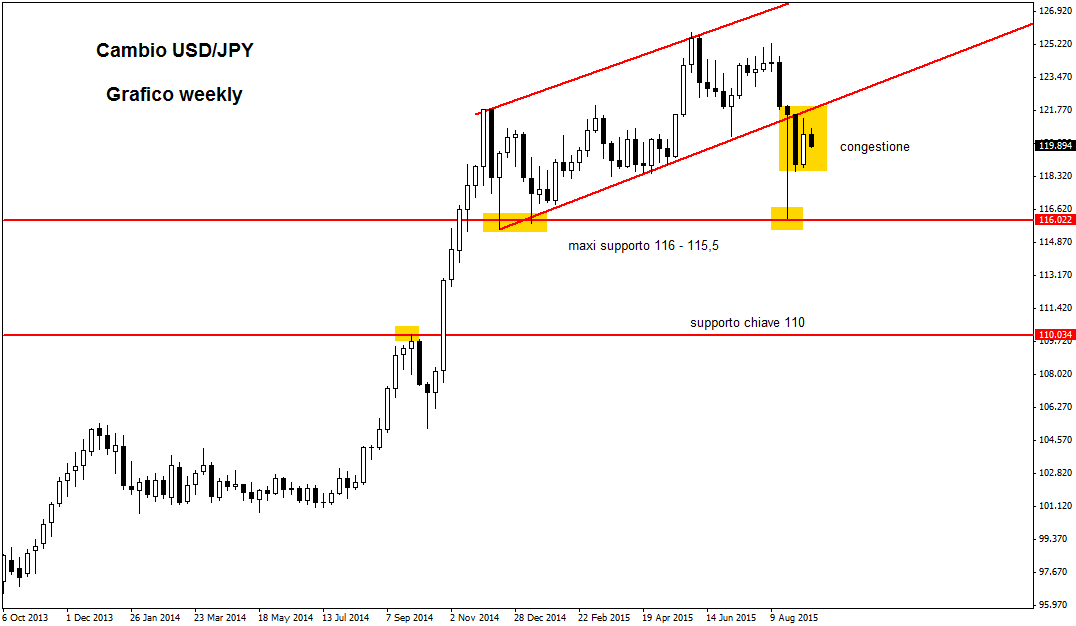 Da un punto di vista tecnico il cambio USD/JPY, attualmente sui minimi di giornata, dovrebbe continuare a muoversi da qui al meeting del FOMC del 16 e 17 settembre tra area 121 e 119. Dopo le decisioni sui tassi di interesse da parte della FED è lecito attendersi un movimento direzionale molto robusto: in caso di breakout rialzista, il cambio dovrebbe tornare in area 123 prima e 125 poi; in caso di sell-off, il cambio potrebbe giungere sui minimi più bassi da fine anno scorso intorno a quota 115. In realtà, in caso di discesa sotto il maxi supporto di 115,5, i prezzi dovrebbero crollare con decisione almeno fino a 110.