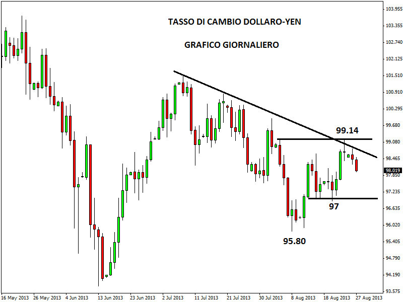 Tuttavia, i dati macroeconomici americani pubblicati ieri sono risultati inferiori alle attese, per cui ora gli analisti finanziari ritengono che le probabilità di avvio del tapering già a settembre siano diminuite. Ad ogni modo l’incertezza sul timing relativo all’inizio del ritiro degli stimoli monetari da parte della FED sta provocando una forte volatilità sulle borse e le valute dei mercati emergenti. Sul forex gli operatori hanno così preferito rifugiarsi nello yen, che solitamente si apprezza nelle fasi di incertezza dei mercati.