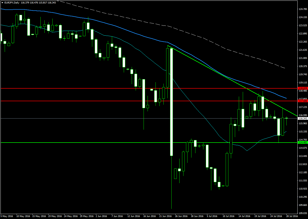 Se la banca centrale del Giappone dovesse invece rimanere inerte, più probabile risulterebbe un nuovo crollo nei cambi, con euro-yen pronto a tornare al di sotto di quota 115, come osservabile dal seguente grafico giornaliero: