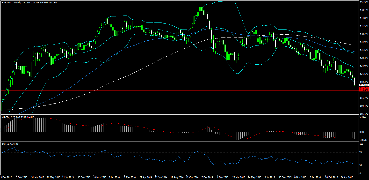 Allo stesso modo euro-yen, dopo il massimo di ieri a 119,5, si è lanciato al ribasso fino a toccare per pochi istanti quota 116, anche in questo caso minimo del 2016 e livello di prezzo che non veniva toccato da quasi tre anni e mezzo, come osservabile dal seguente grafico settimanale: