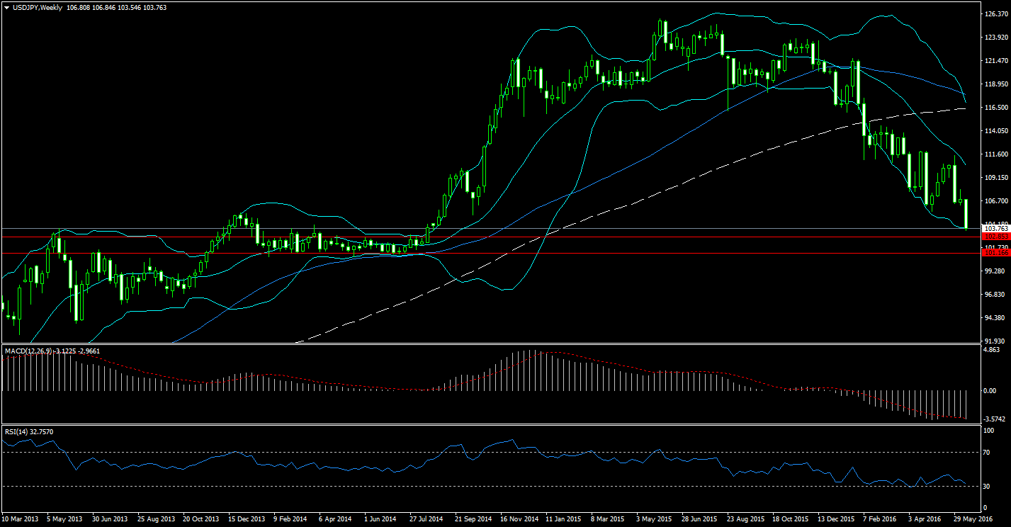 Dollaro-yen solo nella giornata di ieri era riuscito a risalire sopra quota 106, mentre ora si ritrova ad aver perso quasi 3.000 pip e segnare nuovi minimi annuali a 103, inediti negli ultimi due anni della storia del cambio, come osservabile dal seguente grafico settimanale: