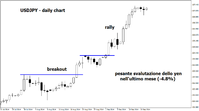Sul forex il tasso di cambio USDJPY si mantiene sopra quota 107 e pochi giorni fa ha raggiunto area 107,40, toccando il massimo più alto dal 2008. Negli ultimi due anni il biglietto verde ha guadagnato il 37% nei confronti dello yen, che si è svalutato molto anche contro euro, sterlina e altre valute del G-10. Il cross EURJPY, invece, quota in area 138,80, ma cinque giorni fa ha toccato il massimo più alto degli ultimi due mesi a 139,20.