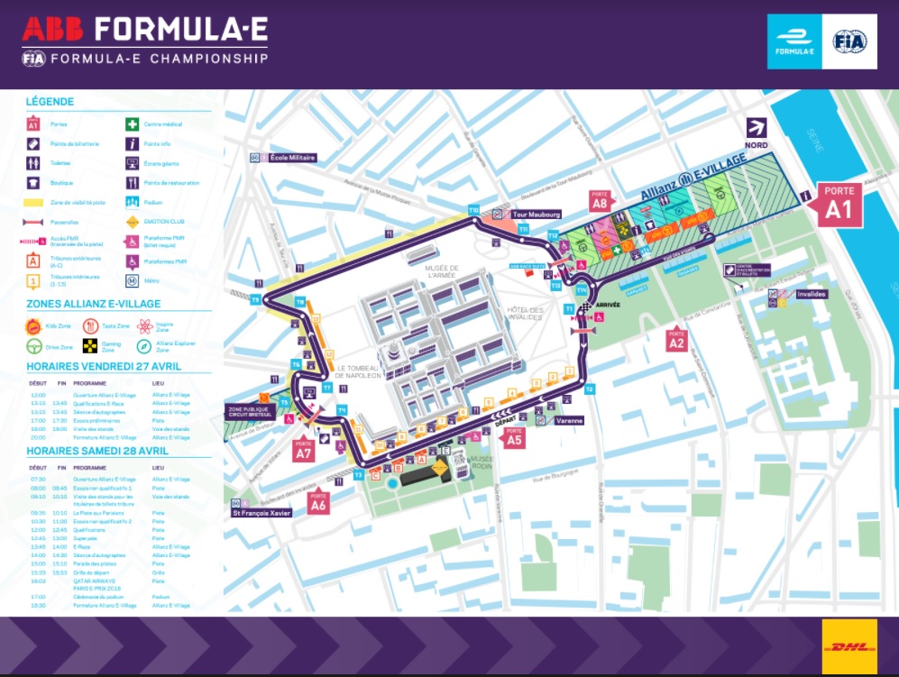 Lungo 1,93 km, è uno dei più brevi del calendario: suddiviso in 14 curve, viene percorso in senso orario attorno al complesso Les Invalides, che comprende anche il Musée de l’Armée e la tomba di Napoleone. Lunga la pitlane che viene ospitata lungo l’Esplanade des Invalides, a nord di Les Invalides. Anche su questo tracciato, come a Roma, gli organizzatori hanno steso un manto di asfalto sui tratti coperti dal tipico ciottolo parigino che rischia di far perdere aderenza alle auto.
