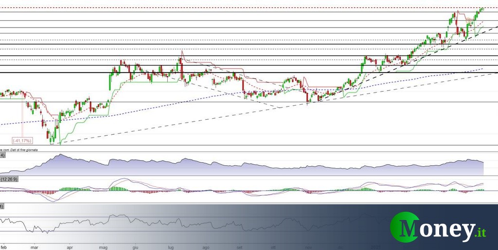 Il titolo allunga oltre il massimo del 16 marzo 2021 e prosegue nelle corsa registrando il nuovo top di periodo a quota 197,09$. Analizziamo l’impostazione tecnica e lo scenario di breve termine.