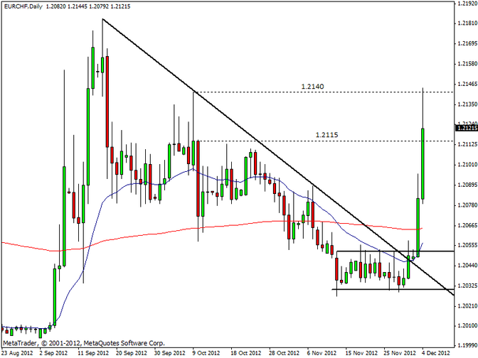 Il franco svizzero torna a muoversi in modo brusco e inaspettato dopo una lunga fase interlocutoria, che ha visto la moneta elvetica muoversi all’interno di range ben definiti. Sul Forex, il buon momento dell’euro ha spinto gli investitori a puntare anche sul rialzo del cambio euro/franco svizzero, che stamattina è salito fino a 1,2144 toccando il massimo più alto da oltre due mesi. Nelle ultime tre sedute il cambio EUR/CHF ha guadagnato oltre 100 pip.