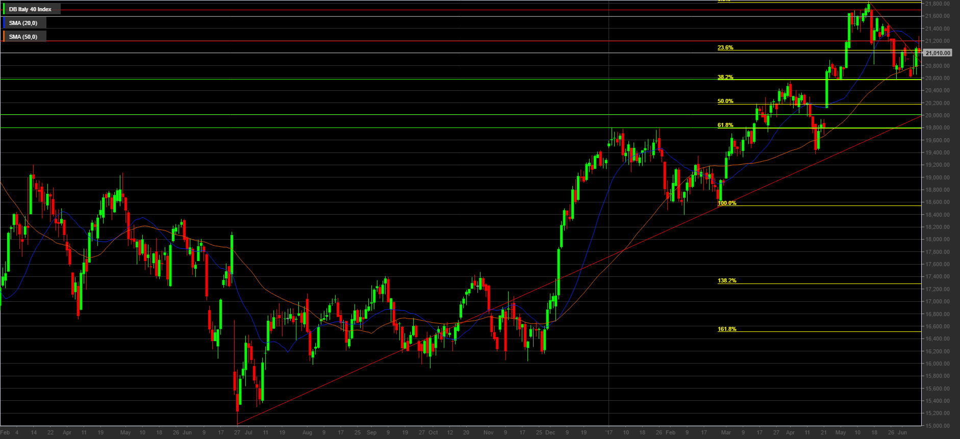L’indice Ftse Mib vede un andamento crescente di breve/medio periodo sul grafico giornaliero sotto riportato. Dopo aver segnato un massimo a quota 21.840 punti il 16 maggio 2017, l’indice italiano ha intrapreso una fisiologica correzione ribassista stampando un minimo a quota 20.570 punti.