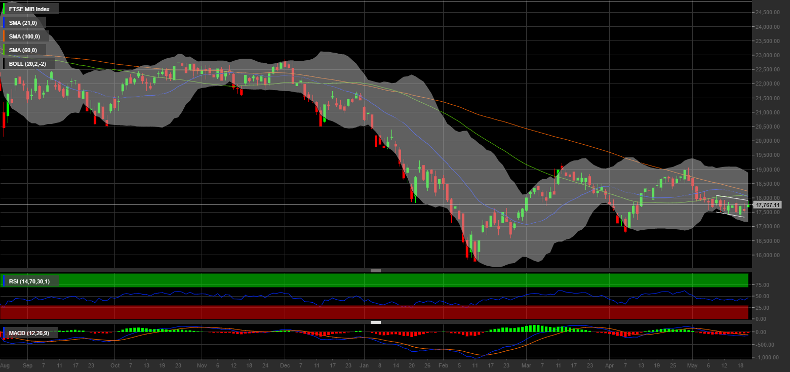 La settimana borsistica conclusasi ieri ha visto una sostanziale parità per l’indice Ftse Mib. Il listino milanese, nonostante la forte volatilità, non ha dato segnali di particolare direzionalità. La volatilità è scattata per diversi fattori. Il primo è sicuramente il tono da falco usato dalla Fed nelle minute di aprile pubblicate mercoledì.
