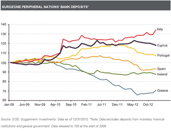 Il grafico in basso mostra un dato piuttosto preoccupante, si tratta della curva dei depositi nei paesi periferici dell’Euro. Quando il settore bancario cipriota riaprirà i battenti, la linea grigia del grafico scenderà velocemente verso il basso, ma la domanda a quel punto sarà: quale altra curva seguirà quella di Cipro, dopo la drammatica reintroduzione nel sistema gravitazionale monetario?