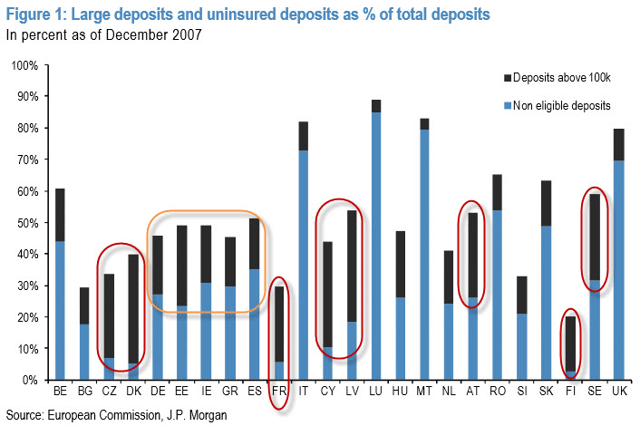 Secondo i più recenti dati, la banca americana JP Morgan fa notare che l’ammontare di conti correnti non assicurati rappresenta circa la metà dei depositi nell’Unione Europea, con una buona parte di flussi diretti verso le zone periferiche UE.