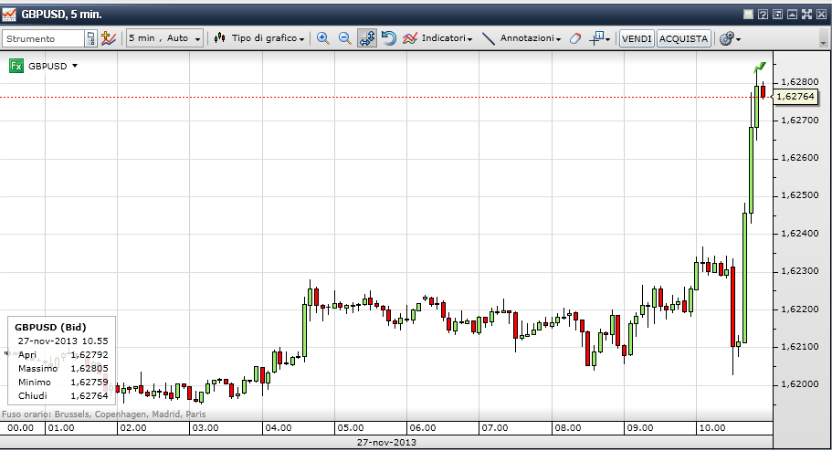 Il grafico del cambio GBPUSD a 5 minuti mostra che il cambio Sterlina/Dollaro ha raggiunto quota 1.6276