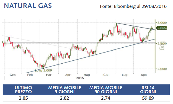Quadro tecnico interasse per la quotazione del Gas naturale, che con la chiusura di giovedì 25 agosto hanno violato al rialzo la resistenza dinamica espressa sul grafico giornaliero con i top decrescenti dell’1 e 29 luglio 2016.