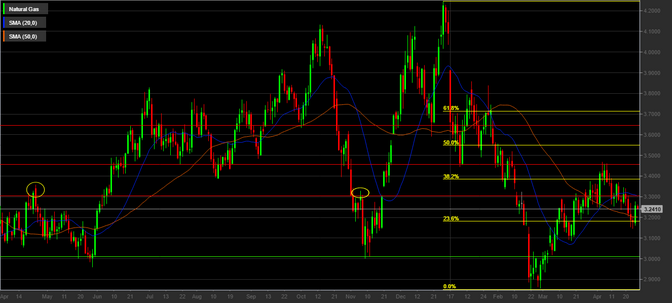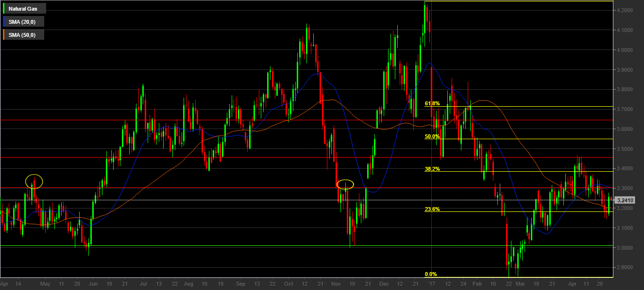 La quotazione del gas naturale vede un periodo di congestione nell’area compresa tra il 38,2% e il 23,6% dei livelli di ritraccimenti di Fibonacci dell’ultima gamba ribassista. Dopo aver toccato un minimo a quota 2,85$ il 22 febbraio 2017, livello più basso da marzo 2016, i prezzi hanno virato al rialzo toccando un massimo a quota 3,47$ il 5 aprile 2017. Da questo livello è iniziata la discesa che ha portato i prezzi a toccare un minimo a quota 3,04$ martedì 25 aprile.